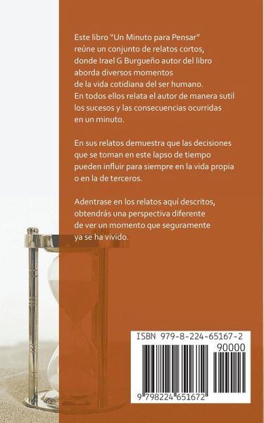 Este libro "Un Minuto para Pensar" reúne un conjunto de relatos cortos, donde Irael G Burgueño autor del libro aborda diversos momentos comunes de la vida del ser humano; el amor, el desamor, la soledad, la amistad, la muerte, lo prohibido, etc. En todos ellos relata el autor de manera sutil los sucesos ocurridos en tan solo un minuto y las consecuencias del tiempo que trae la toma de decisiones personales o de terceros, que tarde o temprano terminan influyendo en nuestra propia vida.