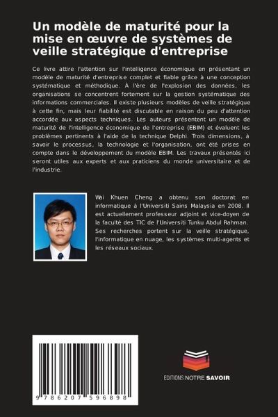 Ce livre attire l'attention sur l'intelligence économique en présentant un modèle de maturité d'entreprise complet et fiable grâce à une conception systématique et méthodique. À l'ère de l'explosion des données, les organisations se concentrent fortement sur la gestion systématique des informations commerciales. Il existe plusieurs modèles de veille stratégique à cette fin, mais leur fiabilité est discutable en raison du peu d'attention accordée aux aspects techniques. Les auteurs présentent un modèle de maturité de l'intelligence économique de l'entreprise (EBIM) et évaluent les problèmes pertinents à l'aide de la technique Delphi. Trois dimensions, à savoir le processus, la technologie et l'organisation, ont été prises en compte dans le développement du modèle EBIM. Les travaux présentés ici seront utiles aux experts et aux praticiens du monde universitaire et de l'industrie.
