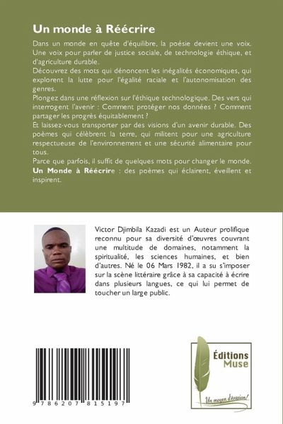 Dans un monde en quête d'équilibre, la poésie devient une voix. Une voix pour parler de justice sociale, de technologie éthique, et d'agriculture durable.Découvrez des mots qui dénoncent les inégalités économiques, qui explorent la lutte pour l'égalité raciale et l'autonomisation des genres.Plongez dans une réflexion sur l'éthique technologique. Des vers qui interrogent l'avenir : Comment protéger nos données ? Comment partager les progrès équitablement ?Et laissez-vous transporter par des visions d'un avenir durable. Des poèmes qui célèbrent la terre, qui militent pour une agriculture respectueuse de l'environnement et une sécurité alimentaire pour tous.Parce que parfois, il suffit de quelques mots pour changer le monde. Un Monde à Réécrire : des poèmes qui éclairent, éveillent et inspirent.