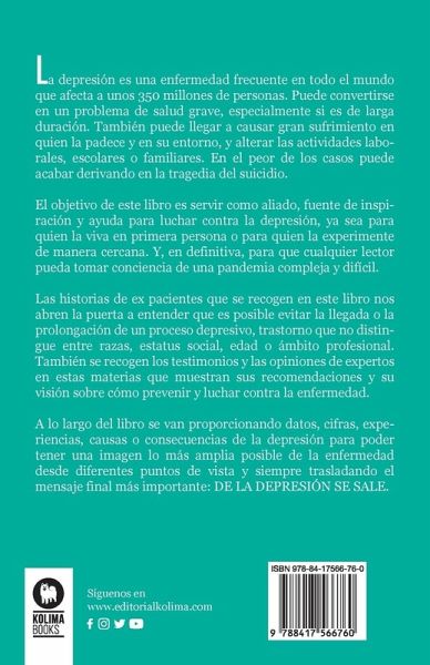 La depresión es una enfermedad frecuente en todo el mundo, y se calcula que afecta a unos 350 millones de personas. Cuando se padece puede convertirse en un problema de salud grave, especialmente si es de larga duración. También puede llegar a causar gran sufrimiento y alterar las actividades laborales, escolares o familiares. En el peor de los casos, puede acabar derivando en la tragedia del suicidio. El objetivo de este libro es servir de aliado, inspiración y ayuda contra la depresión, ya sea para quien lo viva en primera persona o quien lo experimente de manera cercana. Y, en definitiva, para que cualquier lector pueda tomar consciencia de una pandemia compleja y difícil de reconocer. Las historias de ex pacientes que se recogen en este libro nos abren la puerta a poder decir "no" ante la llegada o el padecimiento prolongado de la depresión, una enfermedad que no distingue de razas, status social, edad o ámbito profesional. También se recogen los testimonios y opiniones de profesionales en estas materias, que muestran sus recomendaciones sobre cómo prevenir y luchar contra la enfermedad. A lo largo del libro se irán proporcionando datos, cifras, experiencias, causas o consecuencias de la depresión para poder tener una imagen amplia de la enfermedad desde diferentes puntos de vista.
