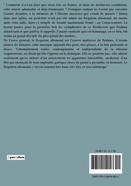 Dans cet essai, Camille Bellaigue explore la profondeur et la signification du "Requiem allemand" de Johannes Brahms, une uvre qu'il considère comme le chef-d'uvre du compositeur. Bellaigue s'interroge sur la rareté de son exécution en France, malgré sa beauté et sa phase de changement après la mort de Brahms. Il souligne la pureté et la piété de cette musique, qui se distingue par son indépendance vis-à-vis de la réforme wagnérienne. Le texte met en lumière le génie classique allemand que Brahms a su préserver, s'inspirant des maîtres tels que Bach, Haydn, Mozart et Beethoven. Bellaigue décrit comment Brahms, à travers son Requiem, parvient à maintenir un équilibre entre sentiment et forme, préférant l'unité et la régularité à la division et à la dissolution. L'auteur analyse la mélodie de Brahms, qui se distingue par sa fluidité et son passage progressif, et la compare à celle de Wagner, plus fluide et changeante. Bellaigue met en avant la fidélité de Brahms aux principes classiques, évolution dans l'harmonisation des voix et des instruments, et dans l'utilisation prudente des modulations. Le Requiem est décrit comme une uvre de méditation et de consolation, éloignée du drame et de la terreur présents dans d'autres compositions similaires. Bellaigue conclut en soulignant la douceur et la paix qui émanent de cette uvre, offrant une promesse de réconfort et d'espoir, et loue Brahms pour sa capacité à établir une paix intérieure chez l'auditeur.
