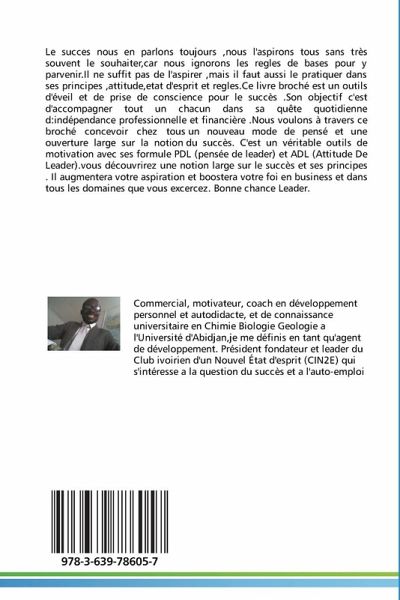 Le succes nous en parlons toujours ,nous l'aspirons tous sans très souvent le souhaiter,car nous ignorons les regles de bases pour y parvenir.Il ne suffit pas de l'aspirer ,mais il faut aussi le pratiquer dans ses principes ,attitude,etat d'esprit et regles.Ce livre broché est un outils d'éveil et de prise de conscience pour le succès .Son objectif c'est d'accompagner tout un chacun dans sa quête quotidienne d:indépendance professionnelle et financière .Nous voulons à travers ce broché concevoir chez tous un nouveau mode de pensé et une ouverture large sur la notion du succès. C'est un véritable outils de motivation avec ses formule PDL (pensée de leader) et ADL (Attitude De Leader).vous découvrirez une notion large sur le succès et ses principes . Il augmentera votre aspiration et boostera votre foi en business et dans tous les domaines que vous excercez. Bonne chance Leader.
