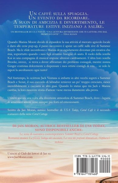 Un caffè sulla spiaggia. Un evento da ricordare. A suon di amicizia e divertimento, le temperature estive iniziano a salire. Un bestseller di USA Today. "Una lettura divertente che ti cattura fin dal primo istante". - Tina Sloan Quando Marina Moore decide di espandere la sua attività al mercato agricolo locale e darsi alle cene pop-up, il passo successivo è aprire un caffè sulle rive di Summer Beach. Ma le sfide incombono e Marina deve rapidamente diventare più creativa che mai, soprattutto quando i suoi figli avranno bisogno di aiuto. Il ruolo della sorella Kai in una compagnia di musical impone ulteriori cambiamenti. L'altra loro sorella Brooke, invece, si trova a dover affrontare dei problemi coniugali, mentre nonna Ginger continua dolcemente a dispensare i suoi ottimi consigli di vita... se solo le nipoti la ascoltassero ogni tanto! Nel frattempo, lo scrittore Jack Ventana si imbatte in altri vecchi segreti a Summer Beach e Scout, il suo cucciolo di labrador retriever un po' troppo cresciuto, riesce incredibilmente a cacciarsi in altri guai. Quando lo status quo tra Jack e Marina cambia, la loro nascente storia d'amore viene messa duramente alla prova. Unitevi ancora una volta alla divertente atmosfera di Summer Beach, dove i legami di amicizia e amore sono sempre più forti ed emozionanti. Scritto da Jan Moran, autrice bestseller di USA Today, Coral Cafè è il secondo romanzo della serie Coral Cottage.