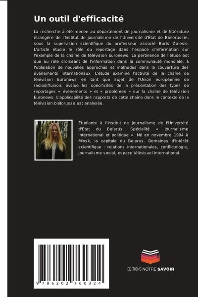 La recherche a été menée au département de journalisme et de littérature étrangère de l'Institut de journalisme de l'Université d'État de Biélorussie, sous la supervision scientifique du professeur associé Boris Zaleski. L'article étudie le rôle du reportage dans l'espace d'information sur l'exemple de la chaîne de télévision Euronews. La pertinence de l'étude est due au rôle croissant de l'information dans la communauté mondiale, à l'utilisation de nouvelles approches et méthodes dans la couverture des événements internationaux. L'étude examine l'activité de la chaîne de télévision Euronews en tant que sujet de l'Union européenne de radiodiffusion, évalue les spécificités de la présentation des types de reportages « événements » et « problèmes » sur la chaîne de télévision Euronews. L'applicabilité des rapports de cette chaîne dans le contexte de la télévision biélorusse est analysée.