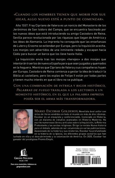 «Cuando los hombres tienen que morir por sus ideas, algo nuevo está a punto de comenzar'. Con una combinación de intriga y rigor histórico, Palabras de fuego traslada a los lectores a un momento histórico, en el que la palabra impresa podía ser el arma más transformadora. Año 1557. Fray Daniel de Ecija es un novicio del Monasterio de los Jerónimos de San Isidoro del Campo, que se encuentra fascinado por las nuevas ideas que está introduciendo su amigo Casiodoro de Reina. Sevilla parece revolucionada por las riquezas que llegan de América y las ideas de Alemania. La imprenta ha conseguido que las enseñanzas de Lutero y Erasmo se extiendan por Europa, pero la Inquisición acecha. Los monjes son advertidos de una inminente redada y escapan hacia Cádiz para buscar un barco que los lleve hasta Italia. La Inquisición envía tras los monjes «herejes' a dos monjes que intentarán traerlos de nuevo a España para que sean juzgados y quemados en la hoguera. Mientras que Daniel de Ecija y sus compañeros huyen por Europa, Casiodoro de Reina comienza a gestar la idea de traducir la Biblia al castellano, pero los espías de Felipe II están en todas partes y tienen mucho interés en que el libro no se publique. «Hubo un tiempo en que los libros podían cambiar el mundo, hacer tambalear los poderes más fuertes y cambiar para siempre la historia'. The Words of Fire "When men have to die for their ideas, something new is about to begin." With a combination of intrigue and historical rigor, The Words of Fire takes readers back to an historical moment when the printed word could be the most transformative weapon. The year 1557. Fray Daniel de Ecija is a novice of the Hieronymite Monastery of San Isidoro del Campo, who is fascinated by the new ideas being introduced by his friend Casiodoro de Reina. Seville seems to be revolutionized by the riches coming from America and the ideas from Germany. The printing press has managed to spread the teachings of Luther and Erasmus throughout Europe, but the Inquisition is lurking. The monks are warned of an imminent raid and escape to Cadiz to find a ship to take them to Italy. The Inquisition sends two monks after the "heretical" monks who will try to bring them back to Spain to be judged and burned at the stake. While Daniel of Ecija and his companions flee through Europe, Casiodoro de Reina starts to develop the idea of translating the Bible into Spanish, but Philip II's spies are everywhere and are very interested in the book not being published. "There was a time when books could change the world, shake up the strongest powers, and change history forever."