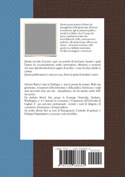 Questo libro raccoglie poesie scritte in un arco di diversi anni. Le poesie portano il lettore dai paesaggi della giovinezza, all'amore, ai sentimenti, agli accadimenti politici e sociali che hanno cambiato l'Italia e il mondo che lo circonda.Incredibilmente belle e profonde nello stesso tempo, offrono una visione del mondo moderno, con gli occhi di un brillante osservatore. Un libro da rileggere e conservare.Questa versione contiene le ultime poesie, le più recenti,nelle quali si percepisce la solitudine dell'autore e il bisogno di fuga verso nuovi orizzonti.