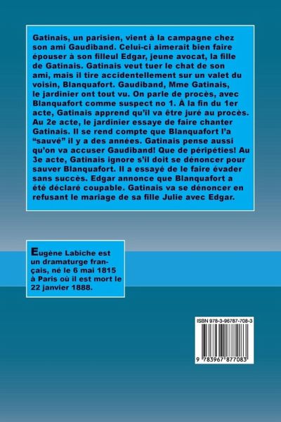 Gatinais, un parisien, vient à la campagne chez son ami Gaudiband. Celui-ci aimerait bien faire épouser à son filleul Edgar, jeune avocat, la fille de Gatinais. Gatinais veut tuer le chat de son ami, mais il tire accidentellement sur un valet du voisin, Blanquafort. Gaudiband, Mme Gatinais, le jardinier ont tout vu. On parle de procès, avec Blanquafort comme suspect no 1. À la fin du 1er acte, Gatinais apprend qu'il va être juré au procès. Au 2e acte, le jardinier essaye de faire chanter Gatinais. Il se rend compte que Blanquafort l'a "sauvé" il y a des années. Gatinais pense aussi qu'on va accuser Gaudiband! Que de péripéties! Au 3e acte, Gatinais ignore s'il doit se dénoncer pour sauver Blanquafort. Il a essayé de le faire évader sans succès. Edgar annonce que Blanquafort a été déclaré coupable. Gatinais va se dénoncer en refusant le mariage de sa fille Julie avec Edgar.