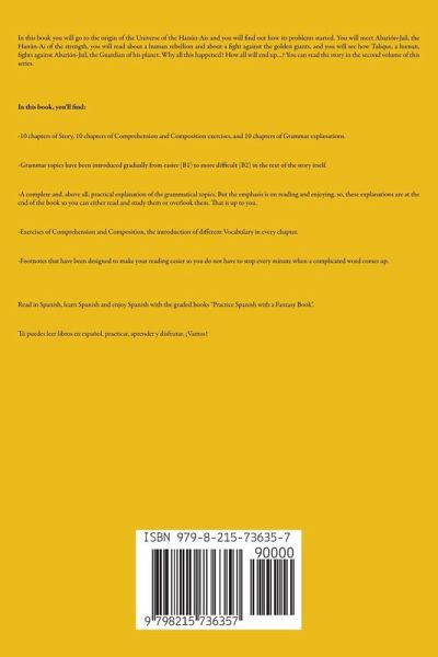 Would you like to find a good book to read in Spanish? Are you tired of short stories that make no sense at all? Are you looking for a good story to read and not only for a book written in easy Spanish? Probably you will like Un Mundo Rojo then. This Spanish book is the second volume of a series called El Universo de los Hanún-Ais. This series is composed of three original fantasy books graded in three levels: A2-B1(Introductory), B1-B2 (Intermediate) and B2-C1 (Advanced). Even though the three novels are placed in the same universe and are connected among them, every book is auto-conclusive, so you do not need to read the other two to understand the story. These books have been written by J.M.Hernández, a native and experienced Spanish teacher who has a degree in Spanish linguistics and more than 10 years of teaching experience. His approach is creating language books with good and clear writing, careful explanation of the grammar and vocabulary, but, above all, with relevant and enjoyable content. He is passionate about fantasy stories and writers like J.R.R. Tolkien and Michael Ende among many others. He also loves helping students to grasp the details of his language. His main objective is to have a really enjoyable story and not merely something boring written in Spanish. His objective is to help you. You can learn Spanish and at the same time enjoy reading. In this book you will go to the origin of the Universe of the Hanún-Ais and you will find out how its problems started. You will meet Abarión-Jaíl, the Hanún-Ai of the strength, you will read about a human rebellion and about a fight against the golden giants, and you will see how Talique, a human, fights against Abarión-Jaíl, the Guardian of his planet. Why all this happened? How all will end up…? You can read the story in the second volume of this series. In this book, you'll find: -10 chapters of Story, 10 chapters of Comprehension and Composition exercises, and 10 chapters of Grammar explanations. -Grammar topics have been introduced gradually from easier (B1) to more difficult (B2) in the text of the story itself. -A complete and, above all, practical explanation of the grammatical topics. But the emphasis is on reading and enjoying, so, these explanations are at the end of the book so you can either read and study them or overlook them. That is up to you. -Exercises of Comprehension and Composition, the introduction of different Vocabulary in every chapter. -Footnotes that have been designed to make your reading easier so you do not have to stop every minute when a complicated word comes up. This volume is the regular version. This means that the answers to the comprehension and vocabulary exercises are included at the end of the book. If you are a teacher and want to use this book in your lessons, make sure that your students buy the Student's Book: With no Answers. We are sure that you will find these books more than helpful for your school year. Read in Spanish, learn Spanish and enjoy Spanish with the graded books "Practice Spanish with a Fantasy Book". Tú puedes leer libros en español, practicar, aprender y disfrutar. ¡Vamos!