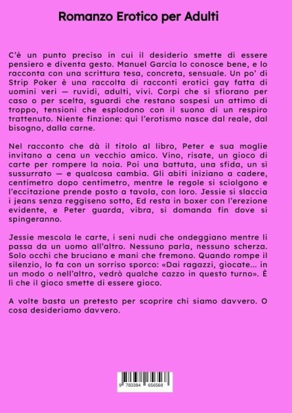 C'è un punto preciso in cui il desiderio smette di essere pensiero e diventa gesto. Manuel García lo conosce bene, e lo racconta con una scrittura tesa, concreta, sensuale. Un po' di Strip Poker è una raccolta di racconti erotici gay fatta di uomini veri - ruvidi, adulti, vivi. Corpi che si sfiorano per caso o per scelta, sguardi che restano sospesi un attimo di troppo, tensioni che esplodono con il suono di un respiro trattenuto. Niente finzione: qui l'erotismo nasce dal reale, dal bisogno, dalla carne.Nel racconto che dà il titolo al libro, Peter e sua moglie invitano a cena un vecchio amico. Vino, risate, un gioco di carte per rompere la noia. Poi una battuta, una sfida, un sì sussurrato - e qualcosa cambia. Gli abiti iniziano a cadere, centimetro dopo centimetro, mentre le regole si sciolgono e l'eccitazione prende posto a tavola, con loro. Jessie si slaccia i jeans senza reggiseno sotto, Ed resta in boxer con l'erezione evidente, e Peter guarda, vibra, si domanda fin dove sispingeranno.Jessie mescola le carte, i seni nudi che ondeggiano mentre li passa da un uomo all'altro. Nessuno parla, nessuno scherza. Solo occhi che bruciano e mani che fremono. Quando rompe il silenzio, lo fa con un sorriso sporco: «Dai ragazzi, giocate... in un modo o nell'altro, vedrò qualche cazzo in questo turno». È lì che il gioco smette di essere gioco.A volte basta un pretesto per scoprire chi siamo davvero. O cosa desideriamo davvero.