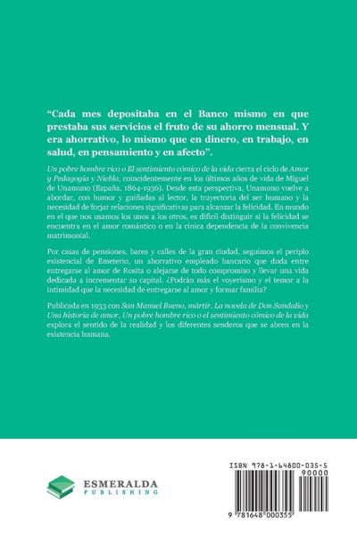 Tesoros de la Hispanidad "Cada mes depositaba en el Banco mismo en que prestaba sus servicios el fruto de su ahorro mensual. Y era ahorrativo, lo mismo que en dinero, en trabajo, en salud, en pensamiento y en afecto". Un pobre hombre rico o El sentimiento cómico de la vida cierra el ciclo de Amor y Pedagogía y Niebla, coincidentemente en los últimos años de vida de Miguel de Unamuno (España, 1864-1936). Desde esta perspectiva, Unamuno vuelve a abordar, con humor y guiñadas al lector, la trayectoria del ser humano y la necesidad de forjar relaciones significativas para alcanzar la felicidad. En mundo en el que nos usamos los unos a los otros, es difícil distinguir si la felicidad se encuentra en el amor romántico o en la cínica dependencia de la convivencia matrimonial. Por casas de pensiones, bares y calles de la gran ciudad, seguimos el periplo existencial de Emeterio, un ahorrativo empleado bancario que duda entre entregarse al amor de Rosita o alejarse de todo compromiso y llevar una vida dedicada a incrementar su capital. ¿Podrán más el voyerismo y el temor a la intimidad que la necesidad de entregarse al amor y formar familia? Publicada en 1933 con San Manuel Bueno, mártir, La novela de Don Sandalio y Una historia de amor, Un pobre hombre rico o el sentimiento cómico de la vida explora el sentido de la realidad y los diferentes senderos que se abren en la existencia humana. Heir of Søren Kierkegaard and a precursor of continental existentialism, Miguel de Unamuno (Spain, 1864-1936) is one of the main European philosophers of the 20th century, and an outstanding Generation of '98 author. A hard-working bank employee, Emeterio is amassing a small fortune, but has a hard time finding love, or even accepting that he might need it. As he ponders his love for Rosita, we will follow him about boarding houses, outskirt bars and the streets of Madrid, as he watches couples from a distance, in search of an intimacy that he has not been able to achieve. Un pobre hombre rico o el sentimiento cómico de la vida (1933), is one of Miguel de Unamuno's last novels and a Spanish classic. It is also the last book in the Amor y Pedagogía and Niebla saga, and revolves around the same concepts: destiny, family and love. This book features witty dialogs and humorous situations, and Unamuno's clear prose is accessible to people who have an advanced command of Spanish.