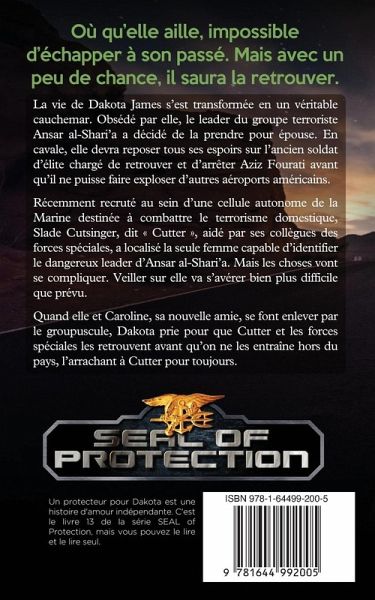 La vie de Dakota James s'est transformée en un véritable cauchemar. Obsédé par elle, le leader du groupe terroriste Ansar al-Shari'a a décidé de la prendre pour épouse. En cavale, elle devra reposer tous ses espoirs sur l'ancien soldat d'élite chargé de retrouver et d'arrêter Aziz Fourati avant qu'il ne puisse faire exploser d'autres aéroports américains. Récemment recruté au sein d'une cellule autonome de la Marine destinée à combattre le terrorisme domestique, Slade Cutsinger, dit Cutter , aidé par ses collègues des forces spéciales, a localisé la seule femme capable d'identifier le dangereux leader d'Ansar al-Shari'a. Mais les choses vont se compliquer. Veiller sur elle va s'avérer bien plus difficile que prévu. Quand elle et Caroline, sa nouvelle amie, se font enlever par le groupuscule, Dakota prie pour que Cutter et les forces spéciales les retrouvent avant qu'on ne les entraîne hors du pays, l'arrachant à Cutter pour toujours. ** Un protecteur pour Dakota est le treizième tome de la série Forces Très Spéciales. Il peut être lu séparément, mais nous vous recommandons de lire les tomes dans l'ordre afin de profiter au mieux de la série.