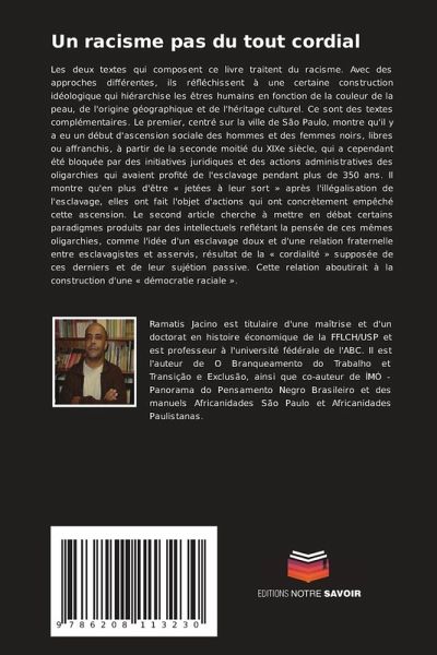 Les deux textes qui composent ce livre traitent du racisme. Avec des approches différentes, ils réfléchissent à une certaine construction idéologique qui hiérarchise les êtres humains en fonction de la couleur de la peau, de l'origine géographique et de l'héritage culturel. Ce sont des textes complémentaires. Le premier, centré sur la ville de São Paulo, montre qu'il y a eu un début d'ascension sociale des hommes et des femmes noirs, libres ou affranchis, à partir de la seconde moitié du XIXe siècle, qui a cependant été bloquée par des initiatives juridiques et des actions administratives des oligarchies qui avaient profité de l'esclavage pendant plus de 350 ans. Il montre qu'en plus d'être « jetées à leur sort » après l'illégalisation de l'esclavage, elles ont fait l'objet d'actions qui ont concrètement empêché cette ascension. Le second article cherche à mettre en débat certains paradigmes produits par des intellectuels reflétant la pensée de ces mêmes oligarchies, comme l'idée d'un esclavage doux et d'une relation fraternelle entre esclavagistes et asservis, résultat de la « cordialité » supposée de ces derniers et de leur sujétion passive. Cette relation aboutirait à la construction d'une « démocratie raciale ».