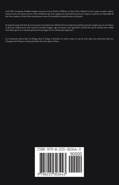 Avril 2022. Lorsqu'une fusillade d'origine inconnue renvoie David et William sur Terre Deux, Michael et Livia restent sur place, sidérés, comme tout le reste de leur univers. Forcés d'admettre que leurs employeurs respectifs font partie des suspects et qu'il leur est impossible de leur faire confiance, ils font front commun pour tenter de rassembler les premières pièces du puzzle. Et quand le temps intervient de nouveau pour tout bouleverser, Michael et Livia comprennent qu'ils ne peuvent compter que sur eux-mêmes et qu'il sont réellement les seuls à pouvoir résoudre l'énigme. Qui est derrière cette opposition à David alors que le monde entier semble avoir admis qui il est. Comment peuvent-ils le protéger, lui et le monde qu'il représente ? Les événements décrits dans Un Refuge dans le Temps se déroulent en même temps ou tout de suite après ceux intervenus dans Les Champions du Temps, le volume précédent de la série Après Cilmeri.