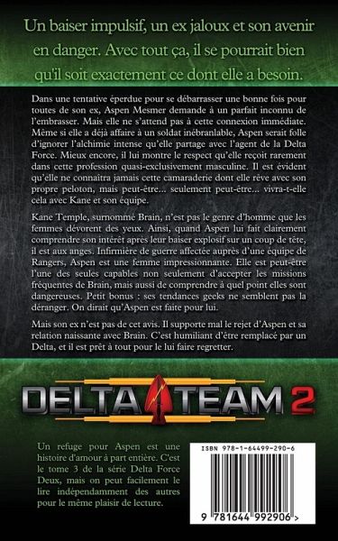 Un baiser impulsif, un ex jaloux et son avenir en danger. Avec tout ça, il se pourrait bien qu'il soit exactement ce dont elle a besoin. Dans une tentative éperdue pour se débarrasser une bonne fois pour toutes de son ex, Aspen Mesmer demande à un parfait inconnu de l'embrasser. Mais elle ne s'attend pas à cette connexion immédiate. Même si elle a déjà affaire à un soldat inébranlable, Aspen serait folle d'ignorer l'alchimie intense qu'elle partage avec l'agent de la Delta Force. Mieux encore, il lui montre le respect qu'elle reçoit rarement dans cette profession quasi-exclusivement masculine. Il est évident qu'elle ne connaîtra jamais cette camaraderie dont elle rêve avec son propre peloton, mais peut-être... seulement peut-être... vivra-t-elle cela avec Kane et son équipe. Kane Temple, surnommé Brain, n'est pas le genre d'homme que les femmes dévorent des yeux. Ainsi, quand Aspen lui fait clairement comprendre son intérêt après leur baiser explosif sur un coup de tête, il est aux anges. Infirmière de guerre affectée auprès d'une équipe de Rangers, Aspen est une femme impressionnante. Elle est peut-être l'une des seules capables non seulement d'accepter les missions fréquentes de Brain, mais aussi de comprendre à quel point elles sont dangereuses. Petit bonus : ses tendances geeks ne semblent pas la déranger. On dirait qu'Aspen est faite pour lui. Mais son ex n'est pas de cet avis. Il supporte mal le rejet d'Aspen et sa relation naissante avec Brain. C'est humiliant d'être remplacé par un Delta, et il est prêt à tout pour le lui faire regretter. Absolument tout... ** Un refuge pour Aspen est le 3e tome de la série Delta Force Deux. Tous les tomes peuvent se lire séparément et ne se terminent pas sur un suspense.