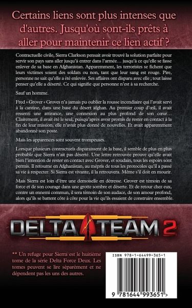 La célébrité a ses avantages et ses inconvénients, mais elle n'aurait jamais imaginé que ce soit une question de vie ou de mort. Contractuelle civile, Sierra Clarkson pensait avoir trouvé la solution parfaite pour servir son pays sans aller jusqu'à entrer dans l'armée... jusqu'à ce qu'elle se fasse enlever de sa base en Afghanistan. Apparemment, les terroristes se fichent que leurs victimes soient des soldats ou non, tant que leur sang est rouge. Pire, personne ne sait qu'elle a été enlevée. Ses affaires ont disparu avec elle ; tout laisse penser qu'elle a déserté. Ce qui signifie que personne n'est à sa recherche. Sauf un homme. Fred Grover Groves n'a jamais pu oublier la rousse incendiaire qui l'avait servi à la cantine, dans une base du désert afghan. Au premier coup d'il, il avait ressenti une attirance, une connexion au plus profond de son cur... Clairement, il avait été le seul, puisqu'après avoir promis de rester en contact à la fin de leur mission, elle n'avait plus donné de nouvelles. Et avait apparemment abandonné son poste. Mais les apparences sont souvent trompeuses. Lorsque plusieurs contractuels disparaissent de la base, il semble de plus en plus probable que Sierra n'ait pas déserté. Une lettre retrouvée prouve qu'elle avait bien l'intention de rester en contact avec Grover, et soudain, tous les espoirs sont permis. Il retourne en Afghanistan, au mépris de tous les protocoles qu'il a passé sa vie à respecter. Si Sierra est vivante, il la retrouvera. Même s'il doit en mourir. Mais Sierra est loin d'être une demoiselle en détresse. Grover est témoin de sa force et de son courage dans une grotte sombre et déserte. Et de retour chez eux, contre un ennemi commun, il sera témoin de son audace, de son amour profond, alors qu'ils se battent côte à côte pour la vie qu'ils essaient de construire ensemble. ** Un refuge pour Sierra est le huitième tome de la série Delta Force Deux. Les tomes peuvent se lire séparément et ne dépendent pas les uns des autres.