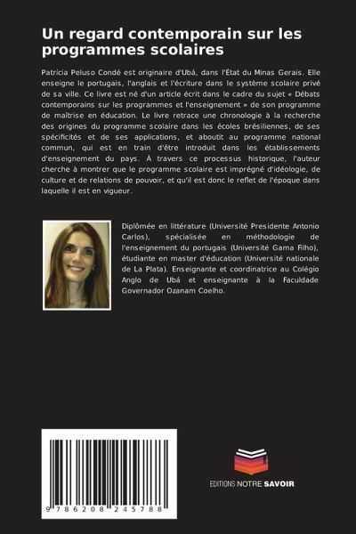 Patrícia Peluso Condé est originaire d'Ubá, dans l'État du Minas Gerais. Elle enseigne le portugais, l'anglais et l'écriture dans le système scolaire privé de sa ville. Ce livre est né d'un article écrit dans le cadre du sujet « Débats contemporains sur les programmes et l'enseignement » de son programme de maîtrise en éducation. Le livre retrace une chronologie à la recherche des origines du programme scolaire dans les écoles brésiliennes, de ses spécificités et de ses applications, et aboutit au programme national commun, qui est en train d'être introduit dans les établissements d'enseignement du pays. À travers ce processus historique, l'auteur cherche à montrer que le programme scolaire est imprégné d'idéologie, de culture et de relations de pouvoir, et qu'il est donc le reflet de l'époque dans laquelle il est en vigueur.