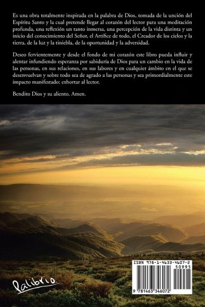 Es una obra totalmente inspirada en la palabra de Dios, tomada de la unción del Espíritu Santo y la cual pretende llegar al corazón del lector para una meditación profunda, una reflexión un tanto inmersa, una percepción de la vida distinta y un inicio del conocimiento del Señor, el Artífice de todo, el Creador de los cielos y la tierra, de la luz y la tiniebla, de la oportunidad y la adversidad. Deseo fervientemente y desde el fondo de mi corazón este libro pueda influir y alentar infundiendo esperanza por sabiduría de Dios para un cambio en la vida de las personas, en sus relaciones, en sus labores y en cualquier ámbito en el que se desenvuelvan y sobre todo sea de agrado a las personas y sea primordialmente este impacto manifestado: exhortar al lector. Bendito Dios y su aliento. Amén.
