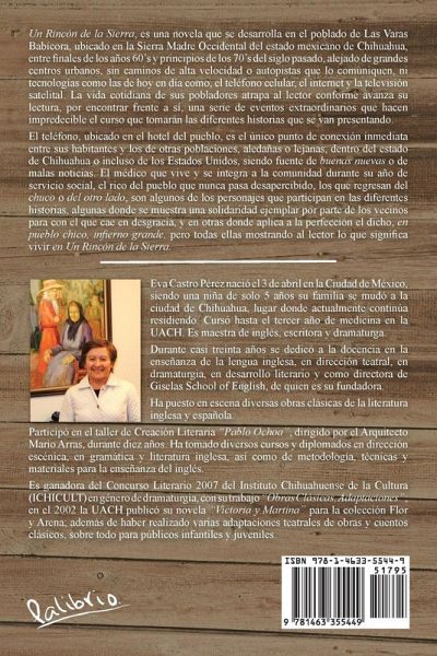 Un Rincón de la Sierra, es una novela que se desarrolla en el poblado de Las Varas Babícora, ubicado en la Sierra Madre Occidental del estado mexicano de Chihuahua, entre finales de los años 60's y principios de los 70's del siglo pasado, alejado de grandes centros urbanos, sin caminos de alta velocidad o autopistas que lo comuniquen, ni tecnologías como las de hoy en día como, el teléfono celular, el internet y la televisión satelital. La vida cotidiana de sus pobladores atrapa al lector conforme avanza su lectura, por encontrar frente a sí, una serie de eventos extraordinarios que hacen impredecible el curso que tomarán las diferentes historias que se van presentando. El teléfono, ubicado en el hotel del pueblo, es el único punto de conexión inmediata entre sus habitantes y los de otras poblaciones, aledañas o lejanas, dentro del estado de Chihuahua o incluso de los Estados Unidos, siendo fuente de buenas nuevas o de malas noticias. El médico que vive y se integra a la comunidad durante su año de servicio social, el rico del pueblo que nunca pasa desapercibido, los que regresan del chuco o del otro lado, son algunos de los personajes que participan en las diferentes historias, algunas donde se muestra una solidaridad ejemplar por parte de los vecinos para con el que cae en desgracia, y en otras donde aplica a la perfección el dicho, en pueblo chico, infierno grande, pero todas ellas mostrando al lector lo que significa vivir en Un Rincón de la Sierra.