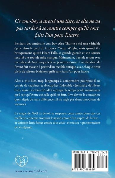 Ce cow-boy a dressé une liste, et elle ne va pas tarder à se rendre compte qu'ils sont faits l'un pour l'autre. Pendant des années, le cow-boy Alex Thorne a été une véritable épine dans le pied de la douce Yvette Wright, mais quand il a brusquement quitté Heart Falls, sa grande gueule et son sourire sexy lui ont tout de suite manqué. Maintenant, il est de retour avec un cadeau de Noël auquel elle ne peut pas résister. Un calendrier de l'avent fait maison à partir d'un meuble antique, avec chaque tiroir plein de raisons évidentes qu'ils sont faits l'un pour l'autre. Alex a mis bien trop longtemps à comprendre pourquoi il ne cessait de taquiner et d'exaspérer l'adorable vétérinaire de Heart Falls, mais il est bien décidé à rattraper le temps perdu maintenant qu'il sait qu'Yvette est celle qu'il lui faut. Il va devoir la convaincre qu'en dépit de leurs différences, il ne s'agit pas d'une amourette de vacances. La magie de Noël va devoir se surpasser cette année pour que ces meilleurs ennemis trouvent le grand amour l'un auprès de l'autre... et unissent leurs forces contre tous ceux ¿ et tout ce ¿ qui tenteraient de les séparer.