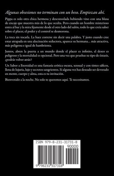 Algunas obsesiones no terminan con un beso. Empiezan ahí. Pippa es solo otra chica hermosa y desconsolada bebiendo vino con una blusa de encaje que muestra más de lo que oculta. Pero cuando un hombre misterioso entra al bar y la mira fijamente desde el otro lado del salón, todo lo que creía saber sobre el placer, el poder y el control se desmorona. La toca sin tocarla. La hace correrse sin decir una palabra. Y justo cuando cree estar atrapada en una alucinación seductora, aparece su hermana... más atractiva, más peligrosa e igual de hambrienta. Juntos, abren la puerta a un mundo donde el placer es infinito, el deseo es peligroso y la mortalidad es opcional. Pero una vez que pruebas su tipo de éxtasis, ¿podrás volver atrás? Un Sabor a Eternidad es una fantasía erótica oscura, sensual y con tintes sáficos, llena de lujuria, lujo y secretos sangrientos. Si alguna vez has deseado ser devorado en mente, cuerpo y alma, esta es tu invitación. Bienvenido a la noche. No solo te queremos aquí. Te necesitamos.