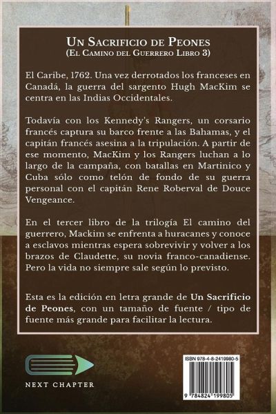 El Caribe, 1762. Una vez derrotados los franceses en Canadá, la guerra del sargento Hugh MacKim se centra en las Indias Occidentales. Todavía con los Kennedy's Rangers, un corsario francés captura su barco frente a las Bahamas, y el capitán francés asesina a la tripulación. A partir de ese momento, MacKim y los Rangers luchan a lo largo de la campaña, con batallas en Martinico y Cuba sólo como telón de fondo de su guerra personal con el capitán Rene Roberval de Douce Vengeance. En el tercer libro de la trilogía El camino del guerrero, Mackim se enfrenta a huracanes y conoce a esclavos mientras espera sobrevivir y volver a los brazos de Claudette, su novia franco-canadiense. Pero la vida no siempre sale según lo previsto. Esta es la edición en letra grande de Un Sacrificio de Peones, con un tamaño de fuente / tipo de fuente más grande para facilitar la lectura.