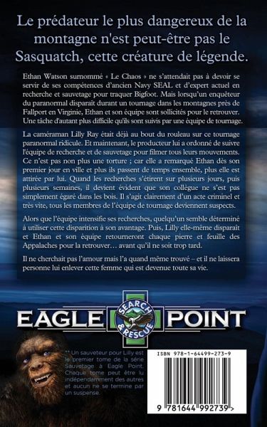 Le prédateur le plus dangereux de la montagne n'est peut-être pas le légendaire yéti. Ethan Watson surnommé Le Chaos ne s'attendait pas à devoir se servir de ses compétences d'ancien Navy SEAL et d'expert actuel en recherche et sauvetage pour traquer Bigfoot. Mais lorsqu'un enquêteur du paranormal disparaît durant un tournage dans les montagnes près de Fallport en Virginie, Ethan et son équipe sont sollicités pour le retrouver. Une tâche d'autant plus difficile qu'ils sont suivis par une équipe de tournage. La caméraman Lilly Ray était déjà au bout du rouleau sur ce tournage paranormal ridicule. Et maintenant, le producteur lui a ordonné de suivre l'équipe de recherche et de sauvetage pour filmer tous leurs mouvements. Ce n'est pas non plus une torture ; car elle a remarqué Ethan dès son premier jour en ville et plus ils passent de temps ensemble, plus elle est attirée par lui. Quand les recherches s'étirent sur plusieurs jours, puis plusieurs semaines, il devient évident que son collègue ne s'est pas simplement égaré dans les bois. Il s'agit clairement d'un acte criminel et très vite, tous les membres de l'équipe de tournage deviennent suspects. Alors que l'équipe intensifie ses recherches, quelqu'un semble déterminé à utiliser cette disparition à son avantage. Puis, Lilly elle-même disparaît et Ethan et son équipe retourneront chaque pierre et feuille des Appalaches pour la retrouver... avant qu'il ne soit trop tard. Il ne cherchait pas l'amour mais l'a quand même trouvé - et il ne laissera personne lui enlever cette femme qui est devenue toute sa vie. ** Un sauveteur pour Lilly est le premier tome de la série Sauvetage à Eagle Point. Chaque tome peut être lu indépendamment des autres et aucun ne se termine par un suspense.