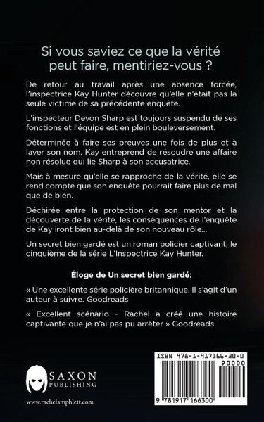 Si vous saviez ce que la vérité peut faire, mentiriez-vous ? De retour au travail après une absence forcée, l'inspectrice Kay Hunter découvre qu'elle n'était pas la seule victime de sa précédente enquête. L'inspecteur Devon Sharp est toujours suspendu de ses fonctions et l'équipe est en plein bouleversement. Déterminée à faire ses preuves une fois de plus et à laver son nom, Kay entreprend de résoudre une affaire non résolue qui lie Sharp à son accusatrice. Mais à mesure qu'elle se rapproche de la vérité, elle se rend compte que son enquête pourrait faire plus de mal que de bien. Déchirée entre la protection de son mentor et la découverte de la vérité, les conséquences de l'enquête de Kay iront bien au-delà de son nouveau rôle... Un secret bien gardé est un roman policier captivant, le cinquième de la série L'Inspectrice Kay Hunter. Éloge de Un secret bien gardé: Une excellente série policière britannique. Il s'agit d'un auteur à suivre. Goodreads Excellent scénario - Rachel a créé une histoire captivante que je n'ai pas pu arrêter Goodreads