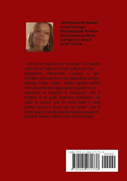 Una storia intrisa di noir sensuale: "Un segreto sulla bocca" mille luci e colori soffusi con due protagonisti d'eccezione Lucrezia e Igor. Immagini sensuali che si sovrappongono, amore, gelosia , intrigo, mistero, thriller, ...sguardi estremi che si toccano per raggiungere il piacere in un crescendo di emozioni e sensazioni, che si fondono in un giallo altamente psicologico. Un giallo su misura per chi vuole osare e vuole sentirsi donna, e anche per gli uomini che in fondo godono nell'assaporare queste sensazioni forti perché se l'amore fa battere il cuore l'eros lo travolge.