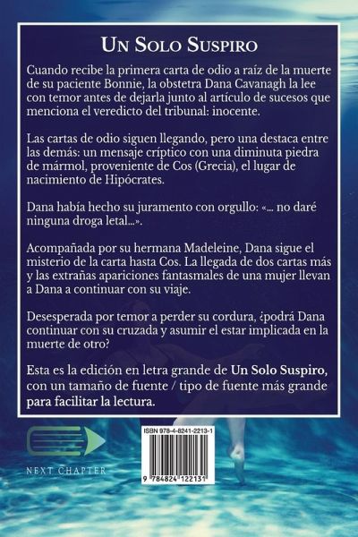Cuando recibe la primera carta de odio a raíz de la muerte de su paciente Bonnie, la obstetra Dana Cavanagh la lee con temor antes de dejarla junto al artículo de sucesos que menciona el veredicto del tribunal: inocente. Las cartas de odio siguen llegando, pero una destaca entre las demás: un mensaje críptico con una diminuta piedra de mármol, proveniente de Cos (Grecia), el lugar de nacimiento de Hipócrates. Dana había hecho su juramento con orgullo: ... no daré ninguna droga letal.... Acompañada por su hermana Madeleine, Dana sigue el misterio de la carta hasta Cos. La llegada de dos cartas más y las extrañas apariciones fantasmales de una mujer llevan a Dana a continuar con su viaje. Desesperada por temor a perder su cordura, ¿podrá Dana continuar con su cruzada y asumir el estar implicada en la muerte de otro? Esta es la edición en letra grande de Un Solo Suspiro, con una fuente / tipo de letra más grande para facilitar la lectura.