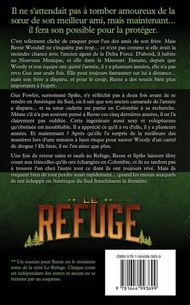 Il ne s'attendait pas à tomber amoureux de la s¿ur de son meilleur ami, mais maintenant... il fera son possible pour la protéger. C'est tellement cliché de craquer pour l'un des amis de son frère. Mais Reese Woodall ne s'inquiète pas trop... ce n'est pas comme si elle avait la moindre chance avec l'ancien agent de la Delta Force. D'abord, il habite au Nouveau Mexique, et elle dans le Missouri. Ensuite, depuis que Woody et son équipe ont quitté l'armée, il y a plusieurs années, elle n'a pas revu Gus une seule fois. Elle peut toujours fantasmer sur lui à distance... mais son frère a disparu, et pour le coup, Reese a des soucis bien plus importants à l'esprit. Gus Fowler, surnommé Spike, n'y réfléchit pas à deux fois avant de se rendre en Amérique du Sud, où il sait que son ancien camarade de l'armée a disparu... et sa s¿ur cadette est partie en Colombie à sa recherche. Même s'il n'a pas souvent pensé à Reese ces cinq dernières années, il ne l'a clairement pas oubliée. Cette ingénieure aussi sexy et voluptueuse qu'obstinée est inoubliable. Il a apprécié ce qu'il a vu d'elle, il y a plusieurs années. Et maintenant ? Après qu'elle l'a surpris de la meilleure des manières lors d'une mission à haut risque pour sauver Woody d'un cartel de drogue ? Eh bien, il ne l'en aime que plus. Une fois de retour sains et saufs au Refuge, Reese et Spike laissent libre cours aux étincelles qu'ils ont échangées en Colombie, et ils ne tardent pas à trouver l'un chez l'autre tout ce dont ils ont toujours rêvé. Mais ils risquent bien de tout perdre aussi rapidement... quand les ennuis auxquels ils ont échappé en Amérique du Sud franchissent la frontière. ** Un soutien pour Reese est le troisième tome de la série Le Refuge. Chaque tome est indépendant des autres et aucun ne se termine par un suspense.