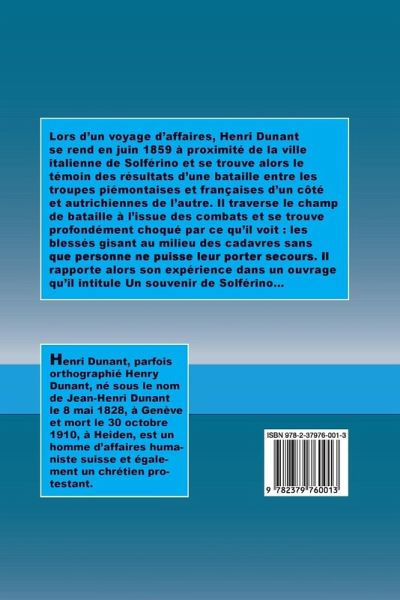 Lors d’un voyage d’affaires, Henri Dunant se rend en juin 1859 à proximité de la ville italienne de Solférino et se trouve alors le témoin des résultats d’une bataille entre les troupes piémontaises et françaises d’un côté et autrichiennes de l’autre. Il traverse le champ de bataille à l’issue des combats et se trouve profondément choqué par ce qu’il voit : les blessés gisant au milieu des cadavres sans que personne ne puisse leur porter secours. Il rapporte alors son expérience dans un ouvrage qu’il intitule Un souvenir de Solférino...