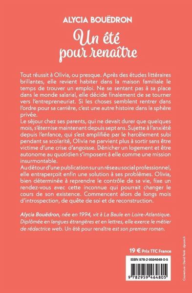 Tout réussit à Olivia, ou presque. Après des études littéraires brillantes, elle revient habiter dans la maison familiale le temps de trouver un emploi. Ne se sentant pas à sa place dans le monde salarial, elle décide finalement de se tourner vers l'entrepreneuriat. Si les choses semblent rentrer dans l'ordre pour sa carrière, c'est une autre histoire dans la sphère privée. Le séjour chez ses parents, qui ne devait durer que quelques mois, s'éternise maintenant depuis sept ans. Sujette à l'anxiété depuis l'enfance, qui s'est amplifiée par le harcèlement subi pendant sa scolarité, Olivia ne parvient plus à sortir sans être victime d'une crise d'angoisse. Dénicher un logement et être autonome au quotidien s'imposent à elle comme une mission insurmontable. Au détour d'une publication sur un réseau social professionnel, elle entraperçoit enfin une solution à ses problèmes. Olivia, bien déterminée à reprendre le contrôle de sa vie, fixe un rendez-vous avec cette inconnue qui pourrait changer le cours de son existence. Commencent alors de longs mois d'introspection, de quête de soi et de reconstruction.