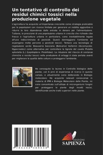 L'agricoltura ha acquisito un'importanza crescente come strategia praticabile per le popolazioni con risorse limitate per generare un reddito aggiuntivo e ridurre la loro dipendenza dalle entrate in denaro per l'alimentazione. Tuttavia, la pressione di una popolazione urbana in crescita che richiede cibo fresco e l'agricoltura urbana in particolare, sono inevitabilmente legate all'uso indiscriminato di pesticidi. Questi danneggiano l'ambiente ed espongono molte persone a pesticidi tossici. Tentare una tecnologia di regolazione verde: Beauveria bassiana (Balsamo) Vuillemin (Ascomycota: Hypocreales) come alternativa per controllare la tignola del cavolo Plutella xylostella (L.) (Lepidoptera: Plutellidae). La riduzione del rilascio di sostanze chimiche e residui tossici nella produzione di ortaggi è stata portata avanti per migliorare la qualità delle colture e proteggere l'ambiente.