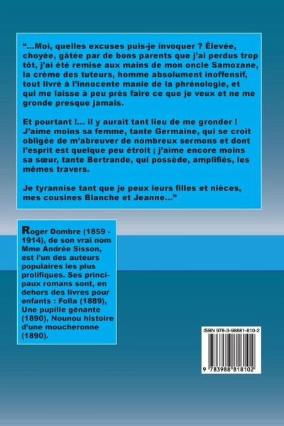 "...Moi, quelles excuses puis-je invoquer ? Élevée, choyée, gâtée par de bons parents que j'ai perdus trop tôt, j'ai été remise aux mains de mon oncle Samozane, la crème des tuteurs, homme absolument inoffensif, tout livré à l'innocente manie de la phrénologie, et qui me laisse à peu près faire ce que je veux et ne me gronde presque jamais. Et pourtant !... il y aurait tant lieu de me gronder ! J'aime moins sa femme, tante Germaine, qui se croit obligée de m'abreuver de nombreux sermons et dont l'esprit est quelque peu étroit ; j'aime encore moins sa s¿ur, tante Bertrande, qui possède, amplifiés, les mêmes travers. Je tyrannise tant que je peux leurs filles et nièces, mes cousines Blanche et Jeanne..."