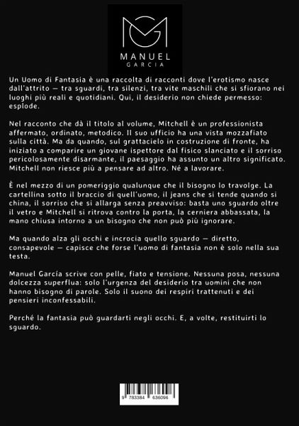 Un Uomo di Fantasia è una raccolta di racconti dove l'erotismo nasce dall'attrito - tra sguardi, tra silenzi, tra vite maschili che si sfiorano nei luoghi più reali e quotidiani. Qui, il desiderio non chiede permesso: esplode.Nel racconto che dà il titolo al volume, Mitchell è un professionista affermato, ordinato, metodico. Il suo ufficio ha una vista mozzafiato sulla città. Ma da quando, sul grattacielo in costruzione di fronte, ha iniziato a comparire un giovane ispettore dal fisico slanciato e il sorriso pericolosamente disarmante, il paesaggio ha assunto un altro significato. Mitchell non riesce più a pensare ad altro. Né a lavorare.È nel mezzo di un pomeriggio qualunque che il bisogno lo travolge. La cartellina sotto il braccio di quell'uomo, il jeans che si tende quando si china, il sorriso che si allarga senza preavviso: basta uno sguardo oltre il vetro e Mitchell si ritrova contro la porta, la cerniera abbassata, la mano chiusa intorno a un bisogno che non può più ignorare.Ma quando alza gli occhi e incrocia quello sguardo - diretto, consapevole - capisce che forse l'uomo di fantasia non è solo nella sua testa.Manuel García scrive con pelle, fiato e tensione. Nessuna posa, nessuna dolcezza superflua: solo l'urgenza del desiderio tra uomini che non hanno bisogno di parole. Solo il suono dei respiri trattenuti e dei pensieri inconfessabili.Perché la fantasia può guardarti negli occhi. E, a volte, restituirti lo sguardo.