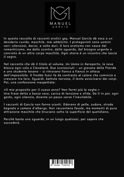 In questa raccolta di racconti erotici gay, Manuel García dà voce a un desiderio ruvido, maschile, mai addolcito. I protagonisti sono uomini veri: silenziosi, decisi, a volte duri. Il loro erotismo non nasce dal romanticismo, ma dallo scontro, dallo sguardo, dal bisogno urgente e concreto di un altro corpo maschile. Ogni storia è un incontro che lascia il segno.Nel racconto che dà il titolo al volume, Un Uomo in Aeroporto, la neve blocca ogni volo a Cleveland. Due sconosciuti - un giovane della Florida e uno studente texano - si ritrovano fianco a fianco in attesa dell'impossibile. Il freddo fuori fa da contrasto al calore che comincia a crescere tra loro. Sguardi, battute nervose, il lento avvicinarsi dei corpi. Poi, una confessione inaspettata:«Il mio proposito per il nuovo anno? Non farmi più le seghe.»Una frase detta a bassa voce, carica di tensione e sfida. Da lì in poi, ogni gesto, ogni silenzio, diventa un passo verso l'inevitabile.I racconti di García non fanno sconti. Odorano di pelle, sudore, strade bagnate e camere d'albergo. Non raccontano favole, ma momenti di pura attrazione maschile che bruciano sotto la superficie del quotidiano.Perché basta uno sguardo, in un luogo qualsiasi, per sapere che succederà.