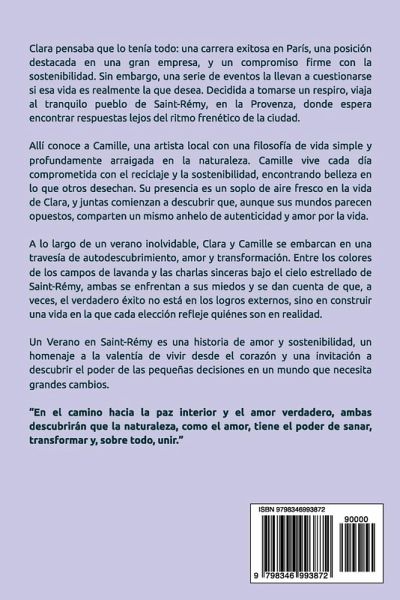 Un Verano en Saint-Rémy es una novela que celebra el amor, la autenticidad y la sostenibilidad en un lugar tan hermoso como es la Provenza. Clara, una ambiciosa bióloga medioambiental que ha labrado su carrera en París, llega a Saint-Rémy buscando un respiro. La presión de su trabajo en una gran empresa, sumada a una ruptura reciente, la han dejado sintiéndose dividida entre sus ideales personales y el frenético ritmo de vida urbano. En este pintoresco pueblo provenzal, rodeada de viñedos, olivos y el aroma de la lavanda en flor, Clara intentará encontrar respuestas a preguntas que ha postergado por demasiado tiempo. Allí conoce a Camille, una artista local que ha hecho de la sostenibilidad su estilo de vida. Con su espíritu libre y una visión de la vida inspirada en el equilibrio y el respeto por la naturaleza, Camille representa el polo opuesto a todo lo que Clara conoce. A través de sus encuentros, Clara se adentra en un mundo más pausado, donde descubre que el amor y la conexión con el entorno pueden transformar la manera en que ve su propia vida y sus prioridades. Sin embargo, sus diferentes perspectivas sobre la vida y el compromiso traerán desafíos que ambas tendrán que enfrentar. A medida que el verano avanza, Clara y Camille construirán juntas una relación en la que exploran sus miedos, sus deseos y su propósito en el mundo. Entre paseos por mercados de productos frescos y visitas a viñedos ecológicos, ambas descubrirán que sus diferencias también son una fuente de fortaleza. En la serenidad de Saint-Rémy, aprenderán que el amor puede ser una fuerza transformadora, capaz de reconciliar incluso las ambiciones más intensas con la búsqueda de paz interior. Nota del Autor Como autor LGBTQ+, Un Verano en Saint-Rémy es mi homenaje a las mujeres que han luchado -y siguen luchando- para abrirse camino en un mundo empresarial que muchas veces parece hecho en su contra. Clara representa esa realidad: una mujer fuerte, ambiciosa y abiertamente lesbiana que ha debido superar no solo barreras profesionales, sino también los prejuicios y expectativas de una sociedad que aún impone demasiados límites a quienes desafían las normas. A su vez, Camille encarna la libertad, el equilibrio y la autenticidad que, muchas veces, las mujeres sienten que deben sacrificar en pro del éxito. En esta novela, ambas personajes encarnan la búsqueda de una vida plena, donde sus identidades no se vean comprometidas por sus elecciones. Es una historia sobre la importancia de crear espacios inclusivos y seguros, donde el amor y el respeto puedan florecer sin restricciones. Un recordatorio de que todos tenemos algo valioso que aportar, y que juntos, al reconocer nuestras diferencias y puntos de conexión, podemos construir un mundo más inclusivo y respetuoso. Espero que esta historia resuene con todas aquellas personas que han tenido que luchar por su lugar, y que inspire a seguir adelante. Porque el verdadero cambio empieza cuando nos apoyamos mutuamente y construimos una sociedad donde cada persona tenga la libertad de ser auténtica y de perseguir sus sueños. Sumérgete en Un Verano en Saint-Rémy y descubre una historia de amor, resiliencia y transformación en el corazón de la Provenza.