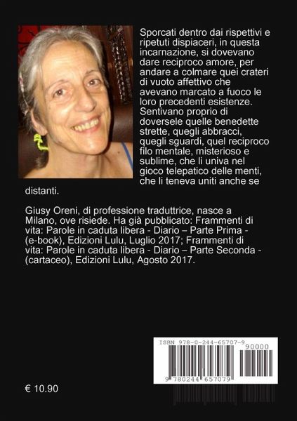 Sporcati dentro dai rispettivi e ripetuti dispiaceri, in questa incarnazione, si dovevano dare reciproco amore, per andare a colmare quei crateri di vuoto affettivo che avevano marcato a fuoco le loro precedenti esistenze. Sentivano proprio di doversele quelle benedette strette, quegli abbracci, quegli sguardi, quel reciproco filo mentale, misterioso e sublime, che li univa nel gioco telepatico delle menti, che li teneva uniti anche se distanti. Giusy Oreni, di professione traduttrice, nasce a Milano, ove risiede. Ha già pubblicato: Frammenti di vita: Parole in caduta libera - Diario - Parte Prima - (e-book), Edizioni Lulu, Luglio 2017; Frammenti di vita: Parole in caduta libera - Diario - Parte Seconda - (cartaceo), Edizioni Lulu, Agosto 2017.
