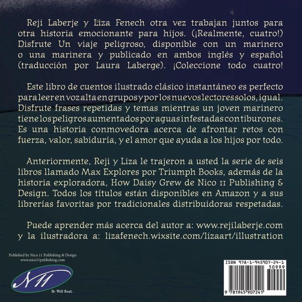 Reji Laberje y Liza Fenech otra vez trabajan juntos para otra historia emocionante para hijos. (¡Realmente, cuatro!) Disfrute Un viaje peligroso, disponible con un marinero o una marinera y publicado en ambos inglés y español (traducción por Laura Laberge). ¡Coleccione todo cuatro! Este libro de cuentos ilustrado clásico instantáneo es perfecto para leer en voz alta en grupos y por los nuevos lectores solos, igual. Disfrute frases repetidas y temas mientras un joven marinero tiene los peligros aumentados por aguas infestadas con tiburones. Es una historia conmovedora acerca de afrontar retos con fuerza, valor, sabiduría, y el amor que ayuda a los hijos por todo. Anteriormente, Reji y Liza le trajeron a usted la serie de seis libros llamado Max Explores por Triumph Books, además de la historia exploradora, How Daisy Grew de Nico 11 Publishing & Design. Todos los títulos están disponibles en Amazon y a sus librerías favoritas por tradicionales distribuidoras respetadas. Puede aprender más acerca del autor a: www.rejilaberje.com y la ilustradora a: lizafenech.wixsite.com/lizaart/illustration