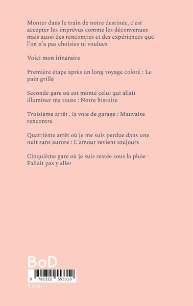 Monter dans le train de notre destinée, c'est accepter les imprévus comme les déconvenues mais aussi des rencontres et des expériences que l'on n'a pas choisies ni voulues. Voici mon itinéraire Première étape après un long voyage coloré : Le pain grillé Seconde gare où est monté celui qui allait illuminer ma route : Notre histoire Troisième arrêt , la voie de garage : Mauvaise rencontre Quatrième arrêt où je me suis perdue dans une nuit sans aurore : L'amour revient toujours Cinquième gare où je suis restée sous la pluie : Fallait pas y aller