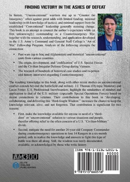 The only pain that exceeds the loss in war, is realizing the "Hard-fought Wisdom" accumulated during battles fought, remained left behind in the ashes of defeat. Society in mass is experiencing pandemic levels of an "inability to deal with discomfort and struggle," after loss and/or setback on all levels. However, this mentality has been rampant across history, especially when recording critical information, lessons, and knowledge from unconventional warfare. These essential lessons could not only save a future generation but guide policies to prevent future conflict in the first place. In history, "Unconventional" warriors rise up to "Counter the Insurgency" often against great odds with limited funding, minimal leadership (with knowledge of tactics), and minimal support from the established "Conventional" leadership generally resisting change. This book is an attempt to connect the author's experience while (at first unknowingly) commanding in a Counterinsurgency War, together with the research, understanding, and application developed in the U.S. Army's Command and General Staff College's "Art of War" Fellowship Program. Analysis of the following attempts the connection:Past wars (up to Iraq and Afghanistan) and historical "unconventional" units from various countries. The origin, development, and "codification" of U.S. Special Forces and the Civilian Irregular Defense Group during Vietnam. The research of hundreds of historical case studies and in-person oral history interviews regarding Counterinsurgency. The resulting knowledge in this book, along with other recent studies on unconventional conflict extends beyond the battlefield and military. J.J. Thomas (Olympic Medalist) and Lucas Foster, U.S. Professional Snowboarders, highlight the similarities of mindset and application to that of the U.S. military (especially Special Operations Forces) based on recent connections to veterans. Their contributions to this book in "developing, collaborating, and delivering this 'Hard-fought Wisdom'" increases the chance to keep the knowledge relevant, alive, and not forgotten.