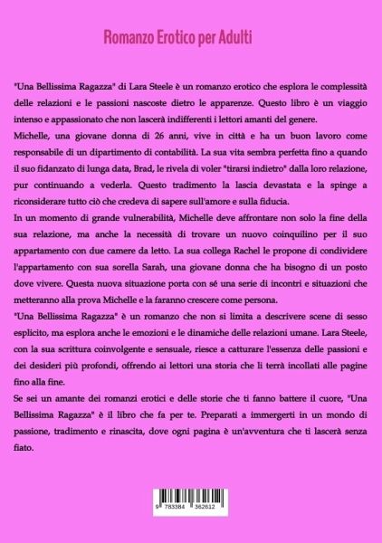 "Una Bellissima Ragazza" di Lara Steele è un romanzo erotico che esplora le complessità delle relazioni e le passioni nascoste dietro le apparenze. Questo libro è un viaggio intenso e appassionato che non lascerà indifferenti i lettori amanti del genere.Michelle, una giovane donna di 26 anni, vive in città e ha un buon lavoro come responsabile di un dipartimento di contabilità. La sua vita sembra perfetta fino a quando il suo fidanzato di lunga data, Brad, le rivela di voler "tirarsi indietro" dalla loro relazione, pur continuando a vederla. Questo tradimento la lascia devastata e la spinge a riconsiderare tutto ciò che credeva di sapere sull'amore e sulla fiducia.In un momento di grande vulnerabilità, Michelle deve affrontare non solo la fine della sua relazione, ma anche la necessità di trovare un nuovo coinquilino per il suo appartamento con due camere da letto. La sua collega Rachel le propone di condividere l'appartamento con sua sorella Sarah, una giovane donna che ha bisogno di un posto dove vivere. Questa nuova situazione porta con sé una serie di incontri e situazioni che metteranno alla prova Michelle e la faranno crescere come persona."Una Bellissima Ragazza" è un romanzo che non si limita a descrivere scene di sesso esplicito, ma esplora anche le emozioni e le dinamiche delle relazioni umane. Lara Steele, con la sua scrittura coinvolgente e sensuale, riesce a catturare l'essenza delle passioni e dei desideri più profondi, offrendo ai lettori una storia che li terrà incollati alle pagine fino alla fine.Se sei un amante dei romanzi erotici e delle storie che ti fanno battere il cuore, "Una Bellissima Ragazza" è il libro che fa per te. Preparati a immergerti in un mondo di passione, tradimento e rinascita, dove ogni pagina è un'avventura che ti lascerà senza fiato.