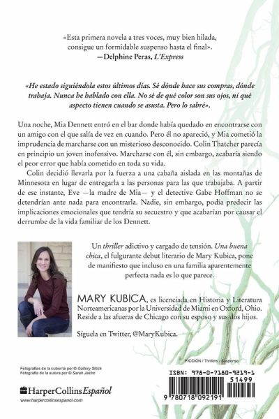 Lee el best seller del que ¿¿todo el mundo est¿¿ hablando! ¿¿Un thriller ingeniosamente construido¿¿. --Chicago Tribune, Printer's Row ¿¿Un vertiginoso debut. A los fans de Gone Girl les encantar¿¿ este evocador relato¿¿. --Lisa Gardner, autora best seller #1 del New York Times ¿¿Un thriller psicol¿¿gico fascinante ¿¿. --Lisa Scottoline, autora best seller del New York Times de Don't you Cry ¿¿He estado sigui¿¿ndola estos ¿¿ltimos d¿¿as. S¿¿ d¿¿nde hace la compra, d¿¿nde trabaja. Nunca he hablado con ella. No s¿¿ de qu¿¿ color son sus ojos, ni qu¿¿ aspecto tienen cuando se asusta. Pero lo sabr¿¿¿¿. Una noche, Mia Dennett entr¿¿ en el bar donde hab¿¿a quedado en encontrarse con un amigo con el que sal¿¿a de vez en cuando. Pero ¿¿l no apareci¿¿, y Mia cometi¿¿ la imprudencia de marcharse con un misterioso desconocido. Colin Thatcher parec¿¿a en principio un ligue inofensivo. Marcharse con ¿¿l, sin embargo, acabar¿¿a siendo el peor error que hab¿¿a cometido en toda su vida. Colin decidi¿¿ llevarla por la fuerza a una cabä¿a aislada en las montä¿as de Minnesota en lugar de entregarla a las personas para las que trabajaba. A partir de ese instante, Eve -la madre de Mia- y el detective Gabe Hoffman no se detendr¿¿an ante nada para encontrarla. Nadie, sin embargo, pod¿¿a predecir las implicaciones emocionales que tendr¿¿a su secuestro y que acabar¿¿an por causar el derrumbe de la vida familiar de los Dennett. Un thriller adictivo y cargado de tensi¿¿n. Una buena chica, el fulgurante debut literario de Mary Kubica, pone de manifiesto que incluso en una familia aparentemente perfecta nada es lo que parece.