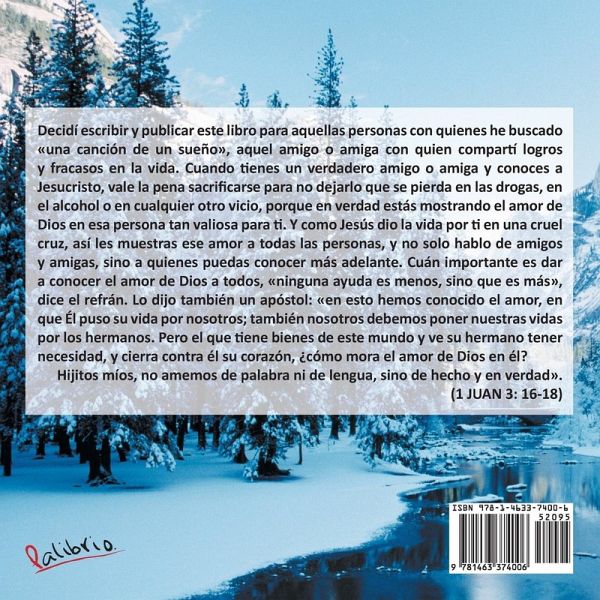 Decidí escribir y publicar este libro para aquellas personas con quienes he buscado una canción de un sueño, aquel amigo o amiga con quien compartí logros y fracasos en la vida. Cuando tienes un verdadero amigo o amiga y conoces a Jesucristo, vale la pena sacrificarse para no dejarlo que se pierda en las drogas, en el alcohol o en cualquier otro vicio, porque en verdad estás mostrando el amor de Dios en esa persona tan valiosa para ti. Y como Jesús dio la vida por ti en una cruel cruz, así les muestras ese amor a todas las personas, y no solo hablo de amigos y amigas, sino a quienes puedas conocer más adelante. Cuán importante es dar a conocer el amor de Dios a todos, ninguna ayuda es menos, sino que es más, dice el refrán. Lo dijo también un apóstol: en esto hemos conocido el amor, en que Él puso su vida por nosotros; también nosotros debemos poner nuestras vidas por los hermanos. Pero el que tiene bienes de este mundo y ve su hermano tener necesidad, y cierra contra él su corazón, ¿cómo mora el amor de Dios en él? Hijitos míos, no amemos de palabra ni de lengua, sino de hecho y en verdad. (1 JUAN 3: 16-18)
