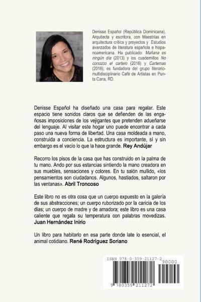 Una casa en la palma de tu mano de la poeta dominicana Denisse Español nos llega en su segunda edición; Una poesía del asombro, una aventura existencial que recobra los sonidos y los colores agazapados en los más escondidos rincones de la casa. Un cuerpo sonoro, auditivo, marcadamente sensorial y juguetón; un libro para degustarse a sorbos, en la plenitud del día y sin relojes. Denisse Español ha publicado previamente "Mañana es ningún día" (2013) y los cuadernillos "No conozco el cartero" (2016) y "Cartemas" (2018).