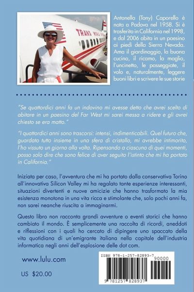 "Se quattordici anni fa un indovino mi avesse detto che avrei scelto di abitare in un paesino del Far West mi sarei messa a ridere e gli avrei chiesto se era matto. I quattordici anni sono trascorsi: intensi, indimenticabili. Quel futuro che, guardato tutto insieme in una sfera di cristallo, mi avrebbe intimorito, l'ho vissuto un giorno alla volta. Ripensando a ciascuno di quei momenti, posso solo dire che sono felice di aver seguito l'istinto che mi ha portato in California." Questo libro non racconta grandi avventure o eventi storici che hanno cambiato il mondo. È semplicemente una raccolta di ricordi, aneddoti e riflessioni con i quali ho cercato di dipingere uno spaccato della vita quotidiana di un'emigrante italiana nella capitale dell'industria informatica negli anni dell'esplosione delle dot com.