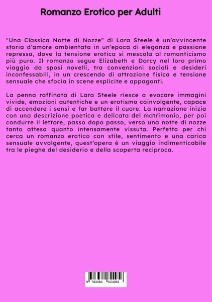 "Una Classica Notte di Nozze" di Lara Steele è un'avvincente storia d'amore ambientata in un'epoca di eleganza e passione repressa, dove la tensione erotica si mescola al romanticismo più puro. Il romanzo segue Elizabeth e Darcy nel loro primo viaggio da sposi novelli, tra convenzioni sociali e desideri inconfessabili, in un crescendo di attrazione fisica e tensione sensuale che sfocia in scene esplicite e appaganti. La penna raffinata di Lara Steele riesce a evocare immagini vivide, emozioni autentiche e un erotismo coinvolgente, capace di accendere i sensi e far battere il cuore. La narrazione inizia con una descrizione poetica e delicata del matrimonio, per poi condurre il lettore, passo dopo passo, verso una notte di nozze tanto attesa quanto intensamente vissuta. Perfetto per chi cerca un romanzo erotico con stile, sentimento e una carica sensuale avvolgente, quest'opera è un viaggio indimenticabile tra le pieghe del desiderio e della scoperta reciproca.