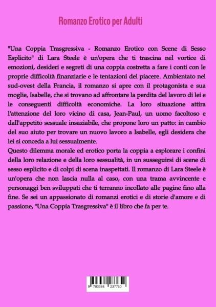 "Una Coppia Trasgressiva - Romanzo Erotico con Scene di Sesso Esplicito" di Lara Steele è un'opera che ti trascina nel vortice di emozioni, desideri e segreti di una coppia costretta a fare i conti con le proprie difficoltà finanziarie e le tentazioni del piacere. Ambientato nel sud-ovest della Francia, il romanzo si apre con il protagonista e sua moglie, Isabelle, che si trovano ad affrontare la perdita del lavoro di lei e le conseguenti difficoltà economiche. La loro situazione attira l'attenzione del loro vicino di casa, Jean-Paul, un uomo facoltoso e dall'appetito sessuale insaziabile, che propone loro un patto: in cambio del suo aiuto per trovare un nuovo lavoro a Isabelle, egli desidera che lei si conceda a lui sessualmente.Questo dilemma morale ed erotico porta la coppia a esplorare i confini della loro relazione e della loro sessualità, in un susseguirsi di scene di sesso esplicito e di colpi di scena inaspettati. Il romanzo di Lara Steele è un'opera che non lascia nulla al caso, con una trama avvincente e personaggi ben sviluppati che ti terranno incollato alle pagine fino alla fine. Se sei un appassionato di romanzi erotici e di storie d'amore e di passione, "Una Coppia Trasgressiva" è il libro che fa per te.