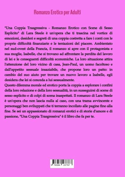 "Una Coppia Trasgressiva - Romanzo Erotico con Scene di Sesso Esplicito" di Lara Steele è un'opera che ti trascina nel vortice di emozioni, desideri e segreti di una coppia costretta a fare i conti con le proprie difficoltà finanziarie e le tentazioni del piacere. Ambientato nel sud-ovest della Francia, il romanzo si apre con il protagonista e sua moglie, Isabelle, che si trovano ad affrontare la perdita del lavoro di lei e le conseguenti difficoltà economiche. La loro situazione attira l'attenzione del loro vicino di casa, Jean-Paul, un uomo facoltoso e dall'appetito sessuale insaziabile, che propone loro un patto: in cambio del suo aiuto per trovare un nuovo lavoro a Isabelle, egli desidera che lei si conceda a lui sessualmente.Questo dilemma morale ed erotico porta la coppia a esplorare i confini della loro relazione e della loro sessualità, in un susseguirsi di scene di sesso esplicito e di colpi di scena inaspettati. Il romanzo di Lara Steele è un'opera che non lascia nulla al caso, con una trama avvincente e personaggi ben sviluppati che ti terranno incollato alle pagine fino alla fine. Se sei un appassionato di romanzi erotici e di storie d'amore e di passione, "Una Coppia Trasgressiva" è il libro che fa per te.