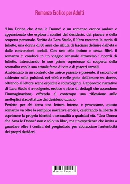 "Una Donna che Ama le Donne" è un romanzo erotico audace e appassionato che esplora i confini del desiderio, del piacere e della scoperta personale. Scritto da Lara Steele, il libro racconta la storia di Juliette, una donna di 80 anni che rifiuta di lasciarsi definire dall'età o dalle convenzioni sociali. Con uno stile intimo e senza filtri, il romanzo ci conduce in un viaggio sensuale attraverso i ricordi di Juliette, intrecciando le sue prime esperienze di scoperta della sessualità con la sua attuale fame di vita e di piaceri carnali.Ambientato in un contesto che unisce passato e presente, il racconto si addentra nelle pulsioni, nei tabù e nelle gioie dell'amore tra donne, offrendo al lettore scene esplicite e coinvolgenti. L'approccio narrativo di Lara Steele è avvolgente, erotico e ricco di dettagli che accendono l'immaginazione, offrendo al contempo una riflessione sulle molteplici sfaccettature del desiderio umano.Perfetto per chi cerca una lettura intensa e provocante, questo romanzo va oltre la semplice narrativa erotica, celebrando la libertà di esprimere la propria identità e sessualità a qualsiasi età. "Una Donna che Ama le Donne" non è solo un libro, ma un'esperienza che invita a guardare oltre i confini del pregiudizio per abbracciare l'autenticità dei propri desideri.